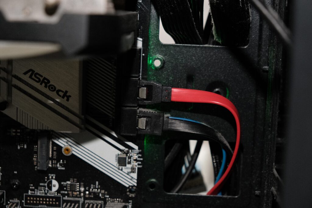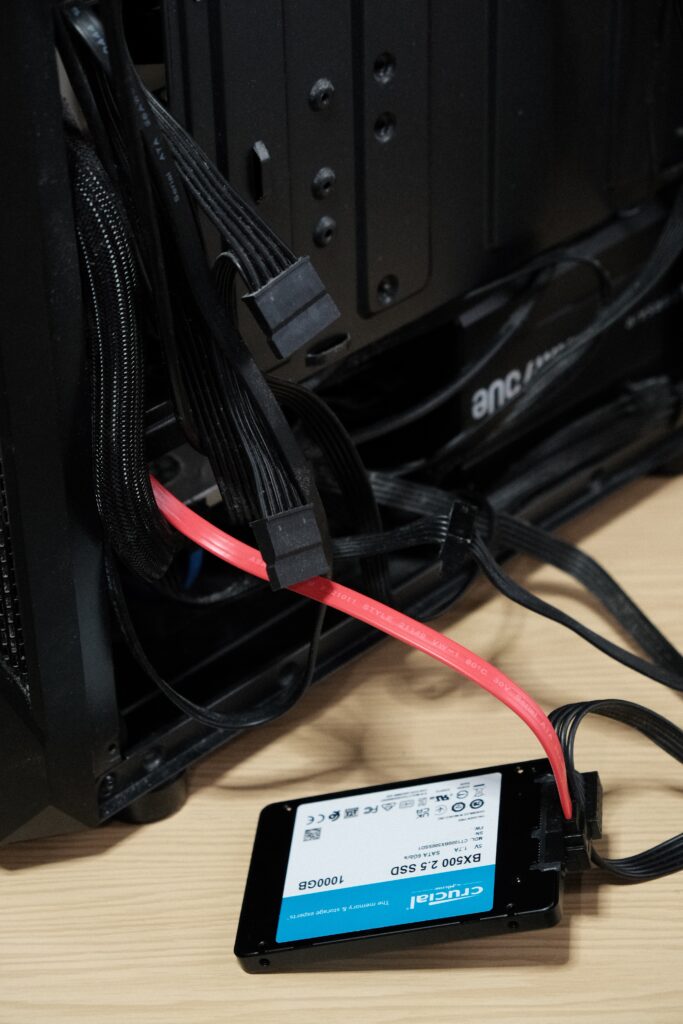 M/BとSSDをSATAケーブルで繋ぎ、電源ユニットから出ているケーブルも同じくSSDに差し込みます。