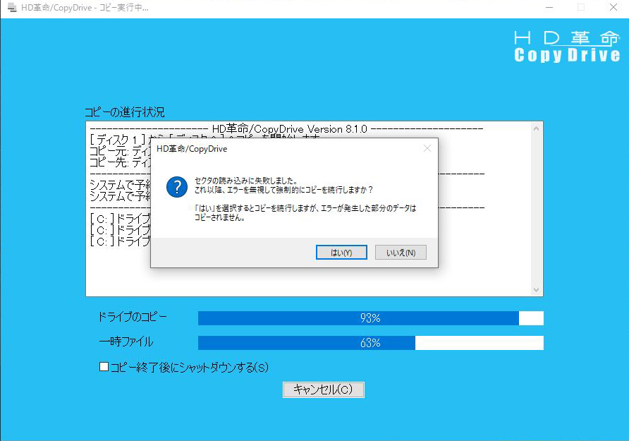 93%までコピーは進んでおり今回のクローン作成の趣旨を考え、コピーを続行しました。